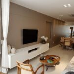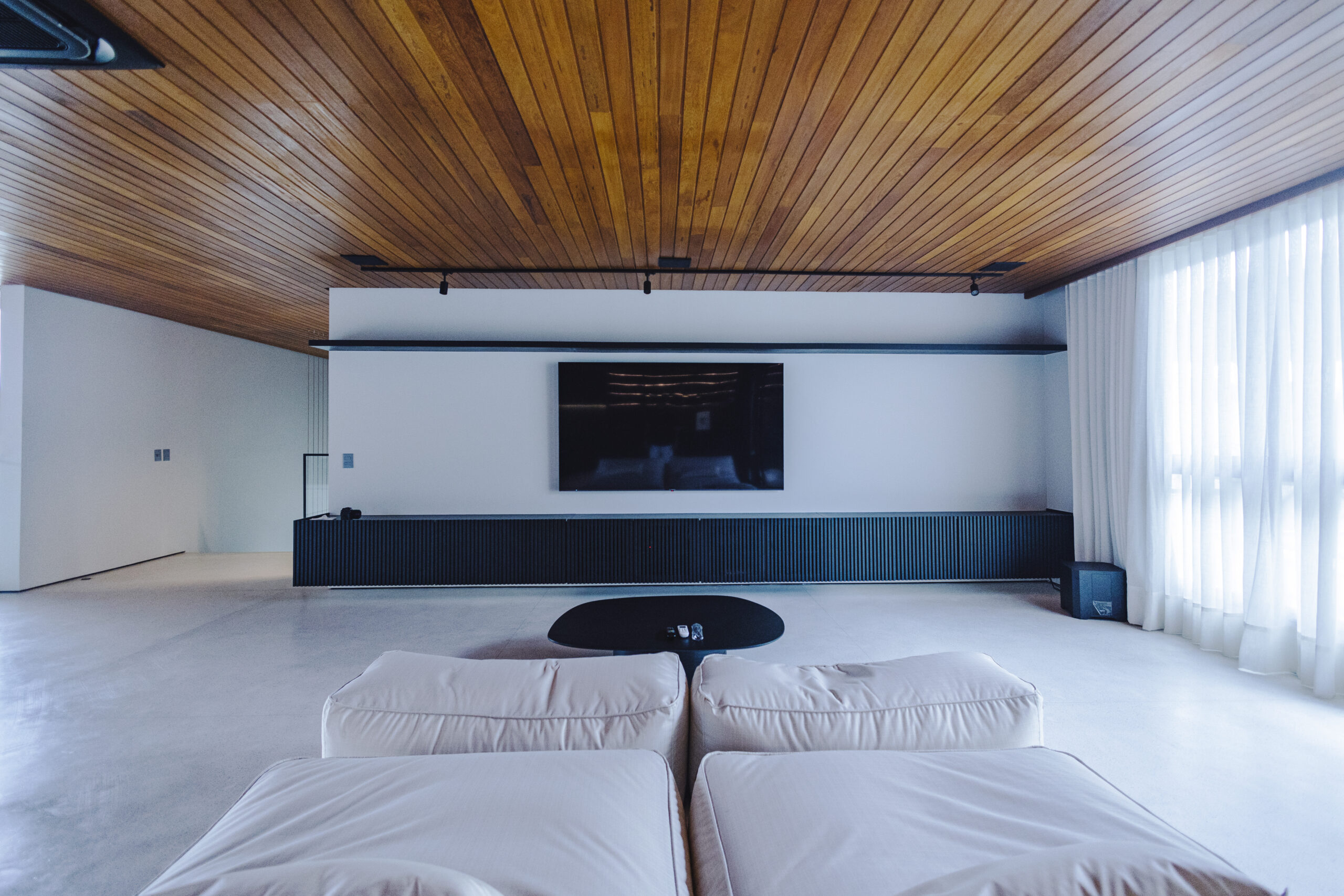 Este projeto explora a horizontalidade do ambiente por meio de um forro em madeira contínua, que percorre toda a sala e cria sensação de amplitude. A marcenaria sob medida integra painel de TV, rack baixo e elementos de apoio, mantendo o ambiente limpo e organizado.